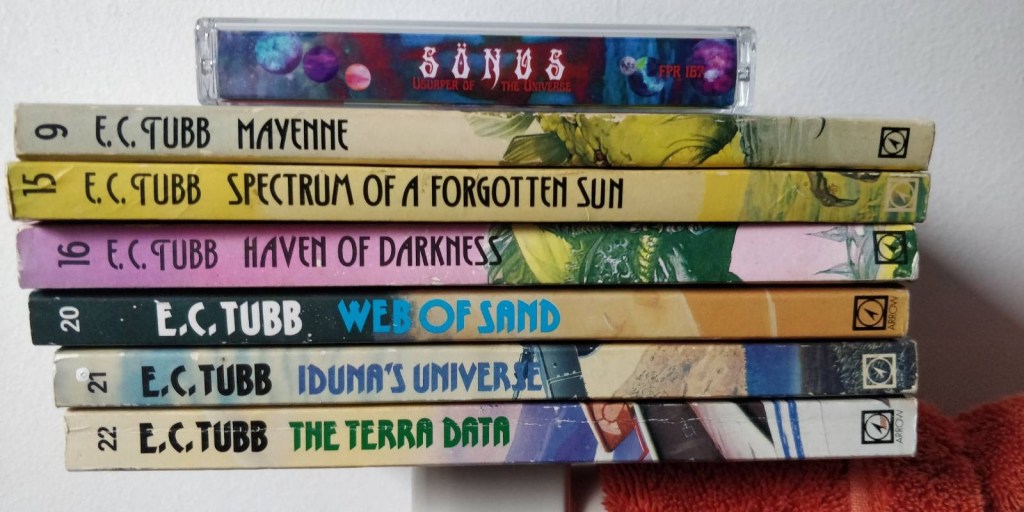 Probably the most significant pick-ups were from Morecambe. Phil and I decided that we should do an Old Pier Special, the subject of which would be whatever pulp scifi or fantasy we could find two copies of (one for each of us). We ended up with E.C. Tubb’s The Winds of Gath, the first in a 35-odd series of short scifi adventures focusing on the travels and travails of Earl Dumarest of Terra. We got our reading done so will be recording that soon. As it happens, I had about twenty of those books back in the day c/o Pops but I never read any of them and, when I moved over to Bradford, they went to charity shops in the great cull. After reading the first instalment though, I may be headed down the rabbit-hole as, a few shops later and after a bit of internet shopping, I’ve amassed a dozen of them again. Place face-palm gif here.