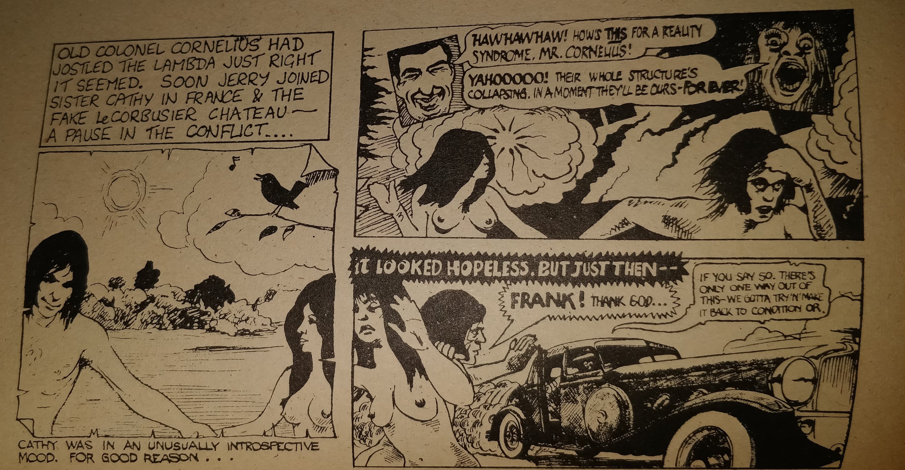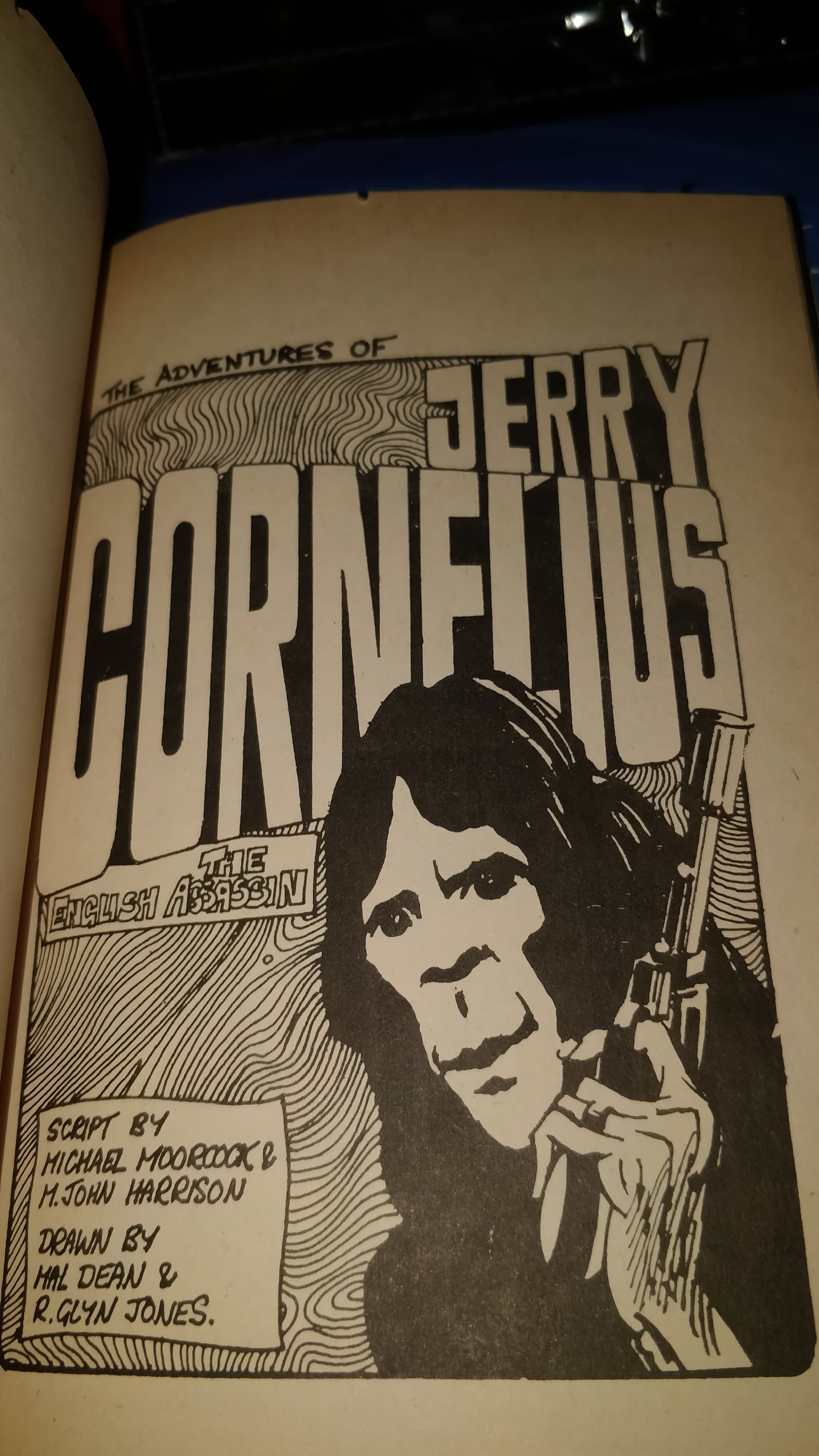 Sandwiched between all of that though was my first introduction to Jerry Cornelius in the form of a 15 page comic strip written by Moorcock and M John Harrison and deliriously illustrated by Mal Dean & R Glyn Jones. It introduced me to the entire Cornelius clan and Miss Brunner, had a tiny cameo from Elric, and was saucy, psychedelic and completely unlike anything I was reading in 2000ad at the time (which itself was pretty out there in the early 80s).